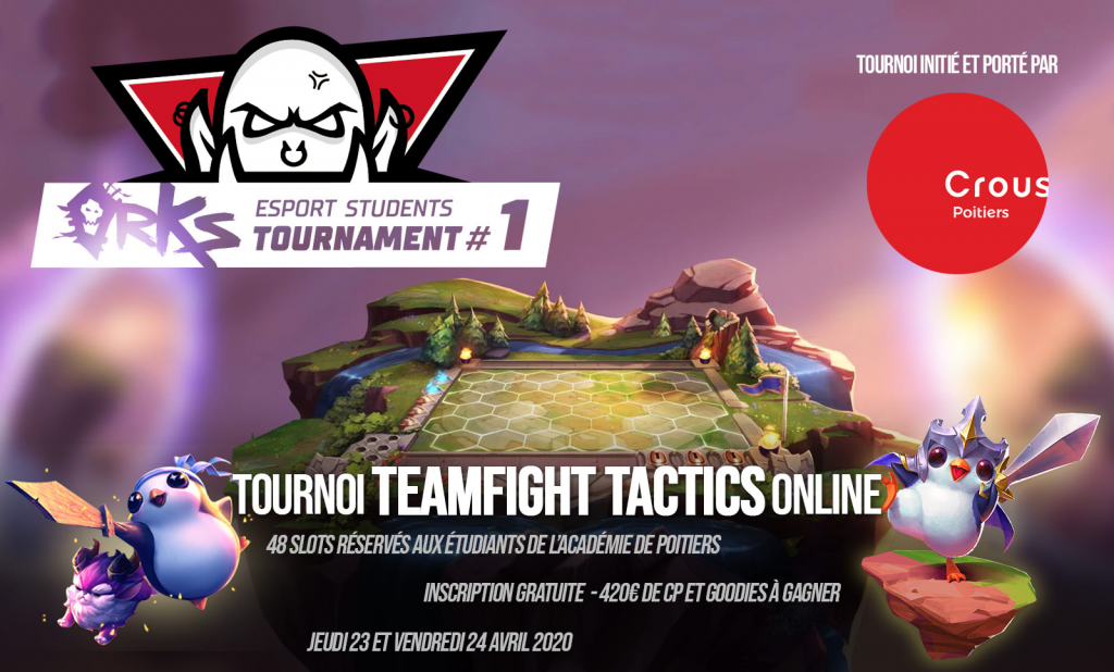 La première édition ou l’orKs EST #1, en version abrégée, sera initiée et portée par le Crous de Poitiers et permettra à 48 étudiants de l’académie de Poitiers de s’affronter gratuitement sur Teamfight Tactics, le jeu free-to-play de Riot Games.