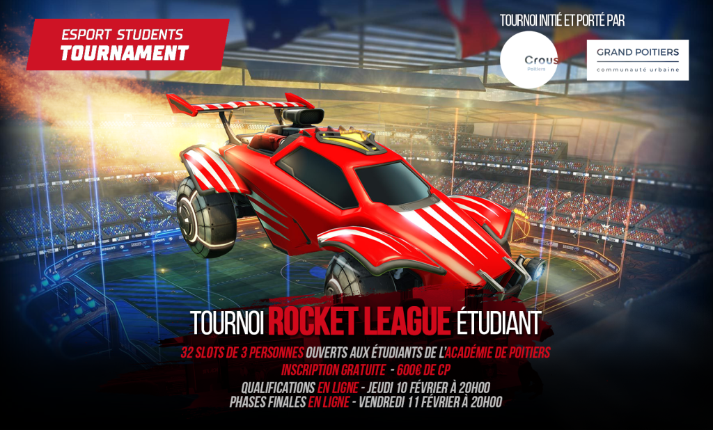L’EST #1 est initiée et portée par le Crous de Poitiers et permettra à 96 étudiants par équipe de 3, soit 32 équipes, de s’affronter gratuitement sur Rocket League, ce mélange détonnant de football d’arcade et de chaos motorisé !