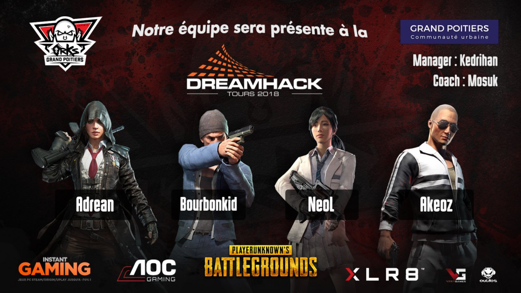 À la suite de la Gamers Assembly, qui était la première LAN française sur PUBG, des remaniements ont été faits dans l’équipe. Adrean et Bourbonkid sont restés, tandis que NeoL et Akeoz nous ont rejoints afin de représenter fièrement nos couleurs sur les scènes françaises et européennes. Ils se rendent à la Dreamhack déterminés et motivés à défendre les couleurs de la Horde, encadrés par leur coach Mosuk et leur manager Kedrihan.