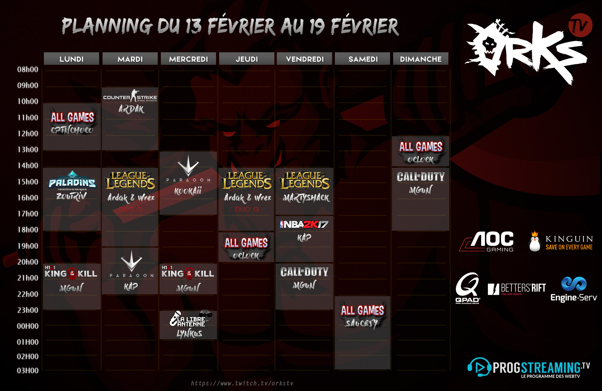 13fevL'association, orKs TV, Stream Tweet Planning TV 13/01 au 19/02 Oh mais c’est le nouveau planning que vla ? Oui c’est bien ça ! Nos streamers vous réservent encore plein de belle chose pour cette nouvelle semaine ! Bonne semaine en notre compagnie ! Je vous invite à suivre nos réseaux sociaux pour avoir un rappel du début des lives : Twitter orKs Facebook orKs orKs TV
