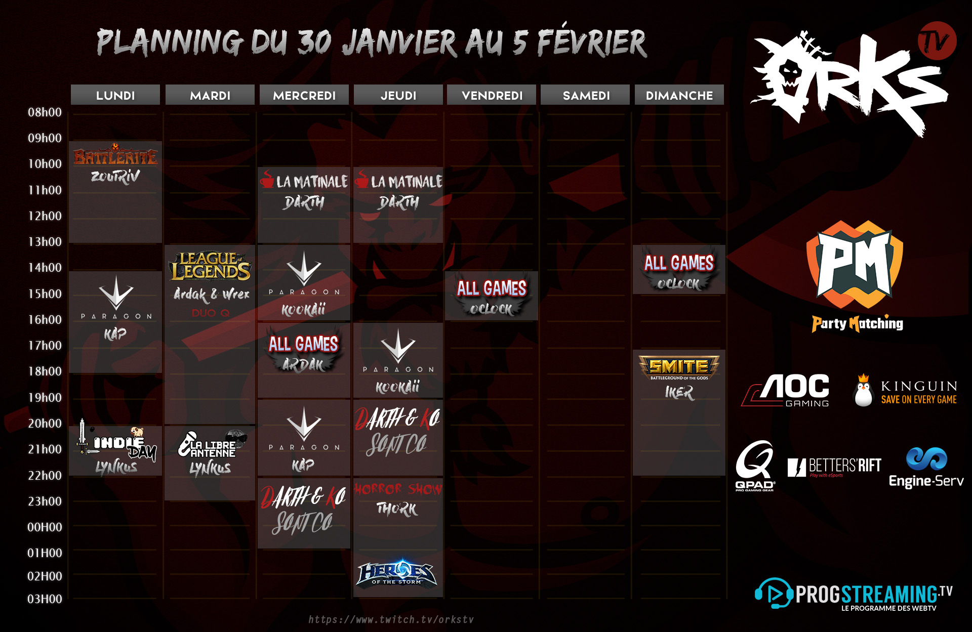Une nouvelle semaine, un nouveau planning sur la orKs TV. Je vous laisse découvrir ce que l’on vous a concocter :